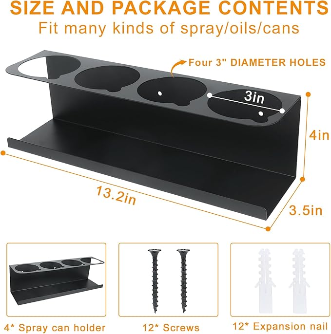 - Each one measures 13.2" W x 4" H x 3.5" D, Diameter of the hole is 3". Maximize storage efficiency with this compact yet spacious spray can organizer! Holds up to 16 cans using these 4 sturdy racks, keeping your workshop, garage, or tool trailer clutter-free while optimizing vertical wall space.