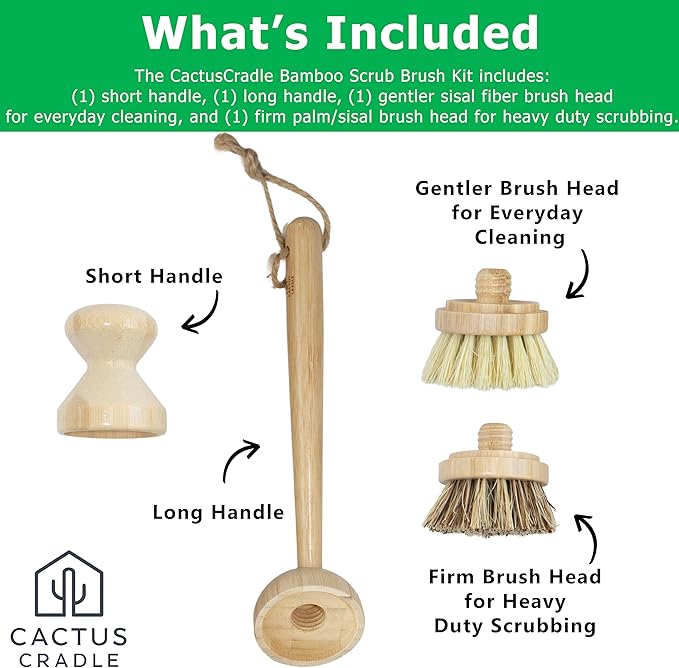 - COMPLETE 4-PIECE BAMBOO SCRUB BRUSH KIT: Includes 2 sturdy bamboo handles and 2 interchangeable brush heads, giving you a versatile and sustainable dishwashing solution that replaces plastic sponges.
