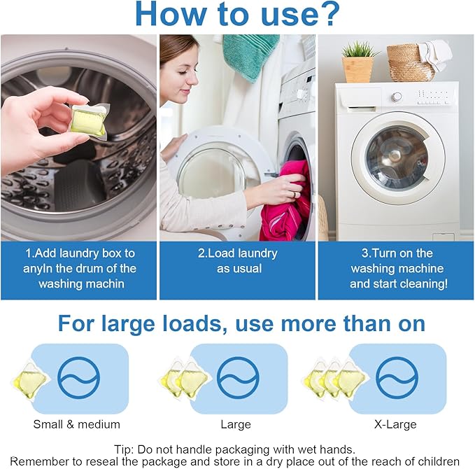 - Convenient and Easy to Use: our laundry detergent soap packs are pre measured; Use one pack for a medium load; Simply toss the laundry pod into the washing machine; These laundry pods dissolve quickly even in cold water, making them suitable for all types of machines, including high efficiency washers