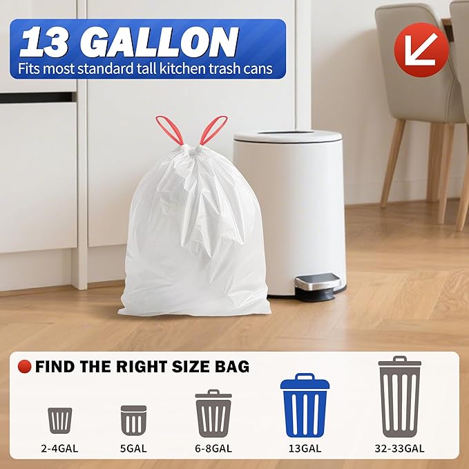 - 13 GALLON TALL KITCHEN GARBAGE BAGS: This package contains 20 large, white, 13-gallon multipurpose drawstring kitchen trash bags. Each bag measures 24 by 25 inches and fits common kitchen, bathroom and office wastebaskets perfectly, preventing overflow and simplifying your cleaning routine.