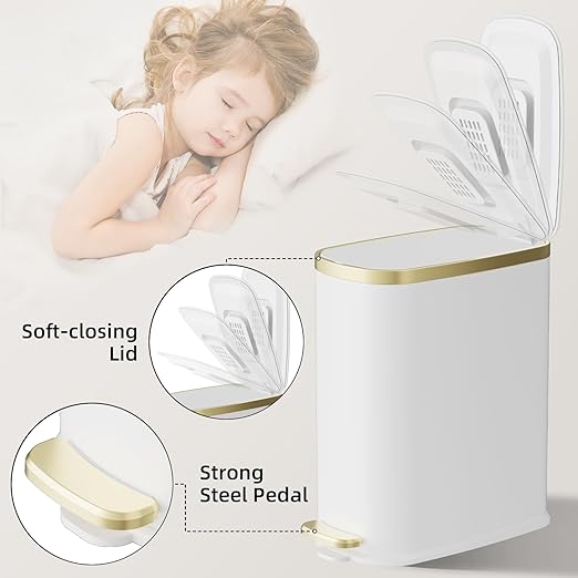 - 【Soft Close & Stay-Open Lid】Enjoy silent, gentle closure with the built-in damper—no loud slams to disturb family or pets. The lid stays open at 90° for hands-free trash disposal, making it easy to replace bags or clean. Enjoy a quiet, mess-free experience in any room.