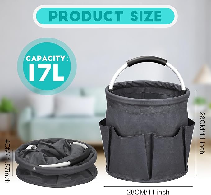 - Large Capacity: The Cleaning caddy with handle approx.28 x 28cm/11 x 11inches. Our 17L bucket cleaning caddy has 6 outer pockets, with 1 large pocket to store the cleaning cloths, bottles, liquids, or sprays. It makes cleaning easier for you and keeps your utensils well organised