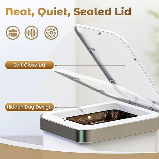 - Silent Soft-Close & Sealed Lid: Hydraulic damping hinge ensure silent open/close without disturbance. The lid forms a tight seal, effectively preventing odors and keeping the indoor air fresh. With its design, it also prevents pets from rummaging through the trash and making a mess in the room