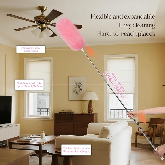 Extendable Lambswool Duster Stainless Steel Handle 133" Removable Feather Duster for Cleaning Ceiling Fans Interior Roof Furniture, Pink
