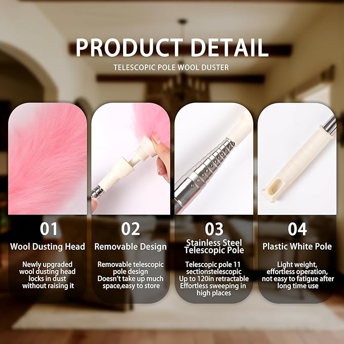 - Gentle care for delicate surfaces: The fluffy and soft texture will not scratch screens or ceramic surfaces, making it ideal for cleaning various delicate items. This extendable wool duster is particularly effective for cleaning computer keyboards, antiques, high-end appliances, and other delicate surfaces
