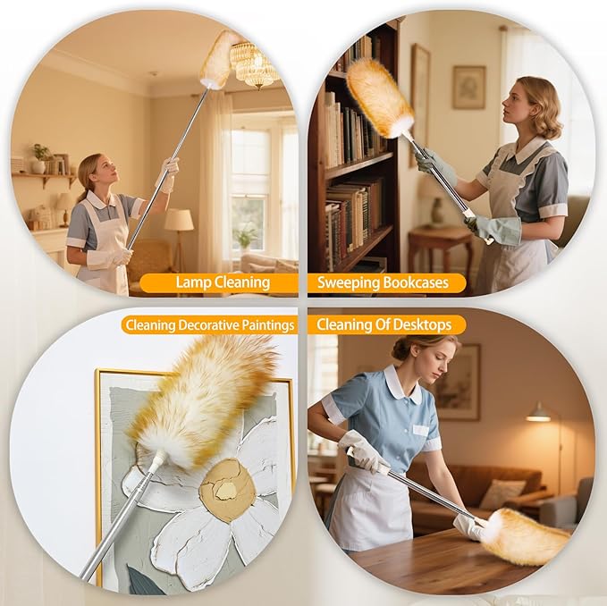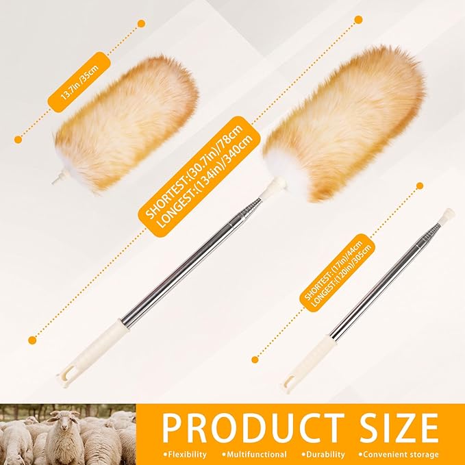 - Multi-function: Lamb wool duster long handle is a good cleaning solution for antiques, tables, pianos, shelves, picture frames, ceiling fans, cars, computer screens, keyboards, plant leaves, dashboards, electronic equipment dust, bookshelves, car, pets hair, ceiling corners, and anywhere narrow or places hard to reach