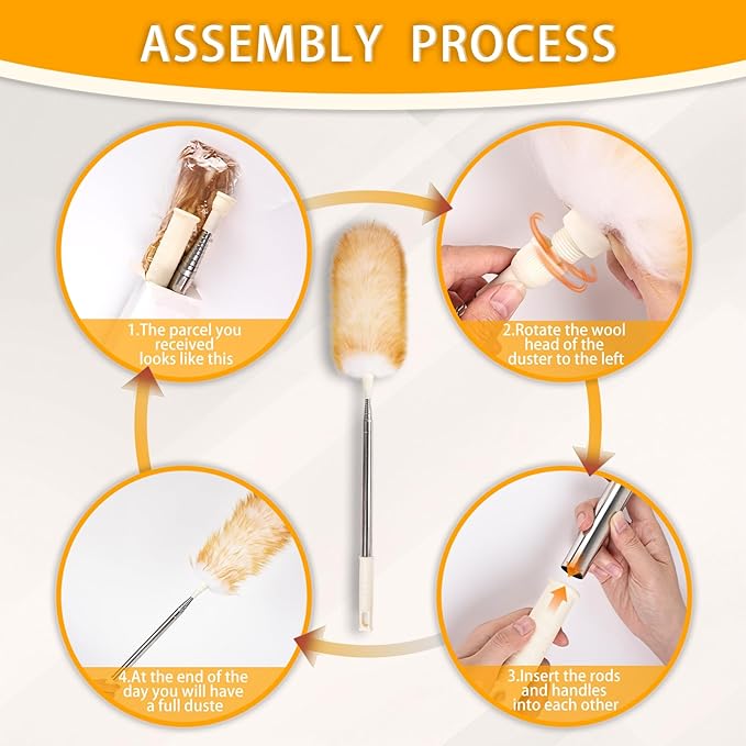 - Usage instructions: After you receive the lambs wool duster long handle, if you see that the feathers are not fluffy, you can turn the handle quickly to fluff up the feathers. Wools can be washed in warm water and then left to dry in a cool, ventilated place
