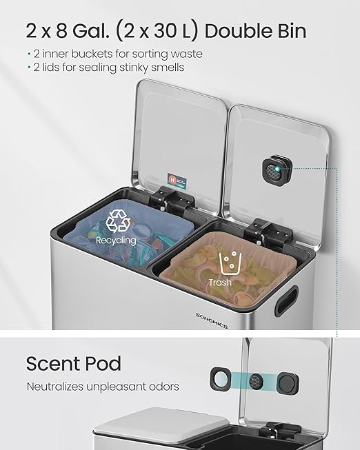 - Ready to Use: This double trash can includes 15 trash bags for immediate use and is compatible with SONGMICS 8-gallon trash bags (code H). The inner bucket features a bag hole to keep liners securely in place