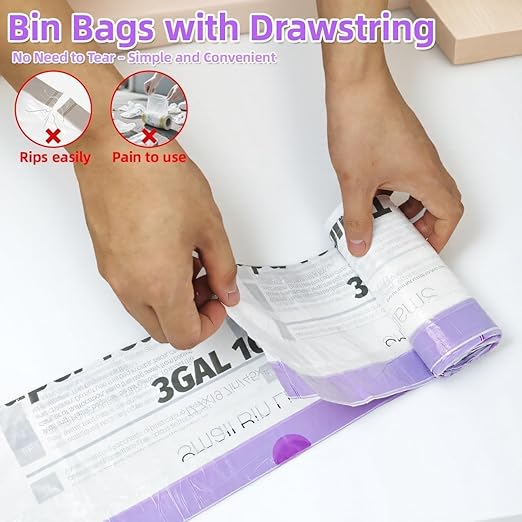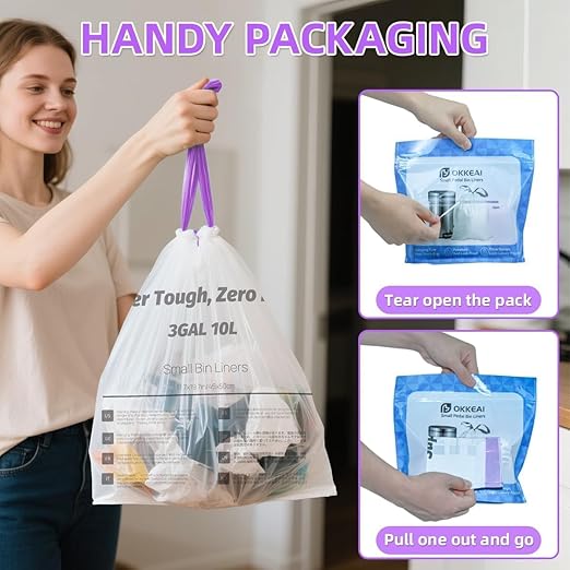 - Perfect Fit for 2.6–3 Gallon Small Trash Cans:Specifically designed for 2.6 gallon trash bags with drawstring and 3 gallon bins, these liners fit snugly in small bathroom trash cans, office wastebaskets, or bedroom bins without slipping.