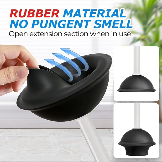 - Extended handle -Heavy Duty Toilet Plunger: Compared to ordinary handles, our upgraded extended handle provides a better user experience and prevents stains from splashing onto the hands.A professional powerful suction cup that can solve various blockage problems. Comfortable handles provide greater support during use
