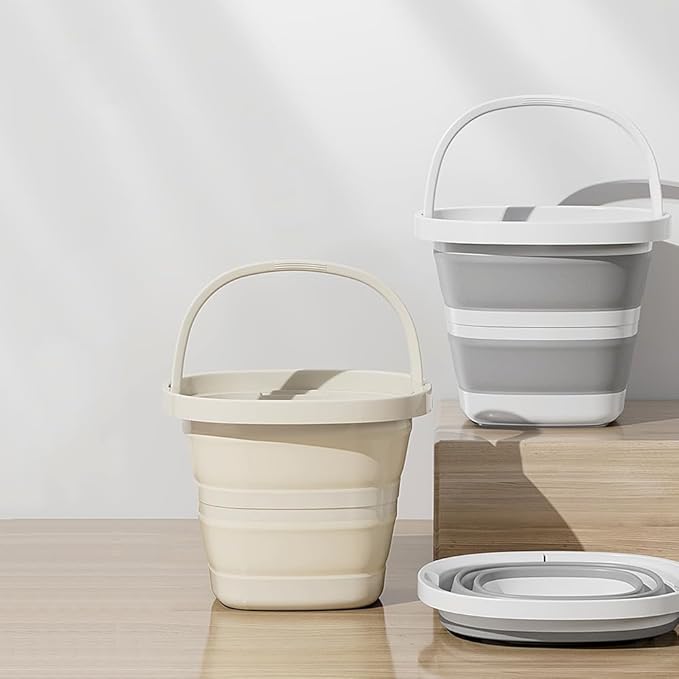 Collapsible Bucket Set, 2.6 Gallon, 2-Pack with Handles, Foldable Design for Camping, RV, Cleaning, Gray and Beige