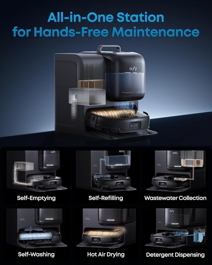 - All-in-One Station: Streamlines daily cleaning with self-emptying, self-washing, self-refilling, hot air drying, automatic detergent dispensing, and wastewater storage.