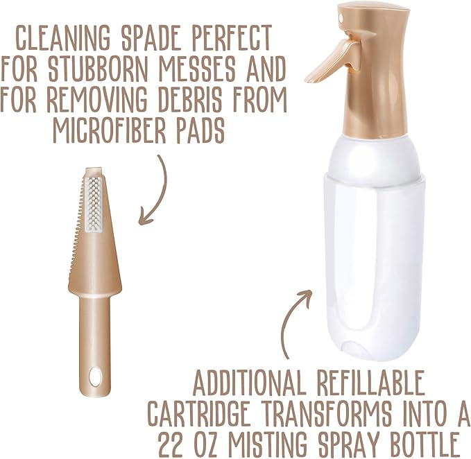- Even Mist Spray, XL Pads, Built-In Scrubber & Cleaning Spade: Deliver a consistent spray with even mist spray technology. Cover more surface in less time with the XL microfiber pads, designed for maximum surface coverage and fewer passes. A built-in scrubbing strip on the mop head tackles sticky messes, and the included cleaning spade lifts stubborn stuck-on debris with precision