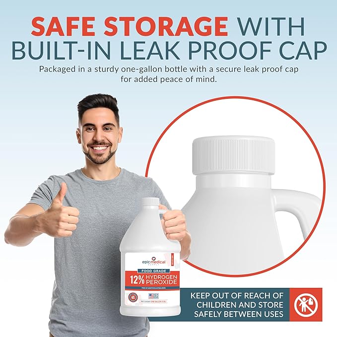 - SAFE STORAGE WITH BUILT-IN SAFETY CAP – packaged in a sturdy one-gallon bottle with a secure safety cap for added peace of mind. Always follow dilution and usage instructions carefully—this strong oxidizing agent may be corrosive to eyes. Keep out of reach of children and store safely between uses
