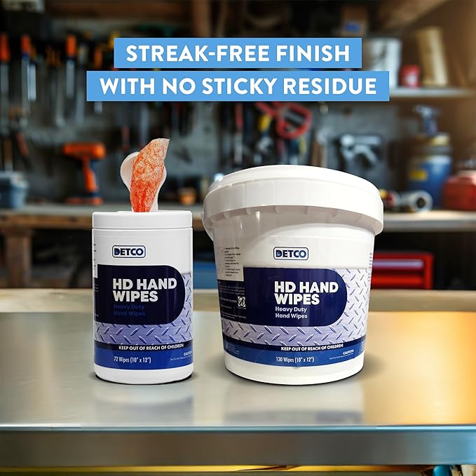 - Dual Surface Cleaning Power: With a smooth side for wiping hands and delicate surfaces and a textured side for scrubbing away grease, paint, oil, dirt, adhesive, and stubborn grime, DETCO Hand & Tool Wipes maximize efficiency without extra supplies