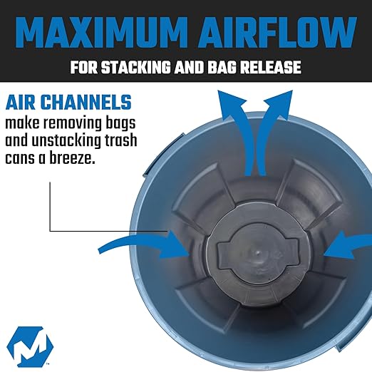 - VENTED CHANNELS: The MAGNUM trash can is constructed with air vents along the sides to allow for garbage bags and liners to easily slide in and out without building air pressure and getting stuck. This design also allows our cans to easily disengage from one another when stacked for transport or storage.
