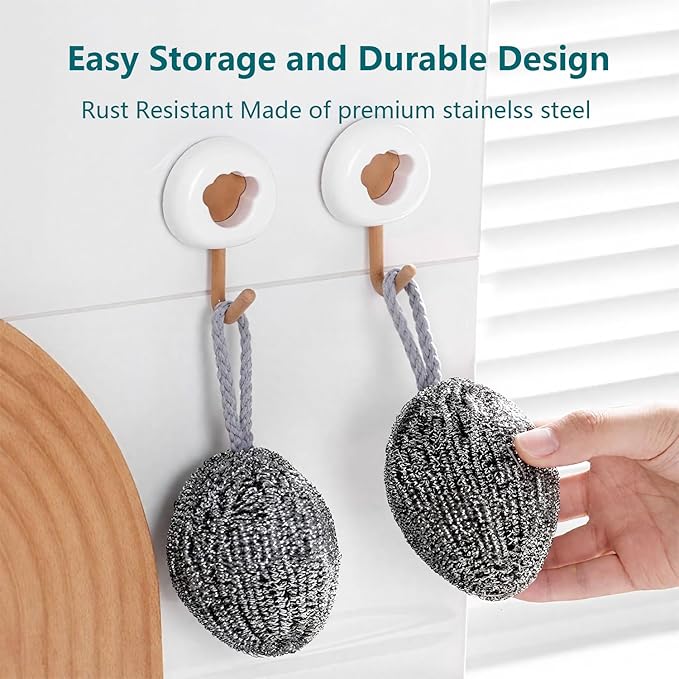- Premium QUALITY: Made of high quality stainless steel, the steel wool scrubbers have internal spiral structure, tightly wound, soft and stretchy, preventing them from loosening, rusting, or hurting hands.Ergonomic design: The diameter of each scourer is 2.0 inches; the height is 3.6 inches, suitable size to hold.Multifunctional: In addition to the kitchen and bathroom, you can use the metal scrubber on the outdoor furniture and in garages. Great for cleaning cookwares, bakewares, ovens, grill racks, pots, pans, sinks, spatulas, etc.Easy to Clean: The steel wool pads can be cleaned easily by rinsing,Comes with a hanging rope for easy storage and quick drying,avoiding bacterial growth.