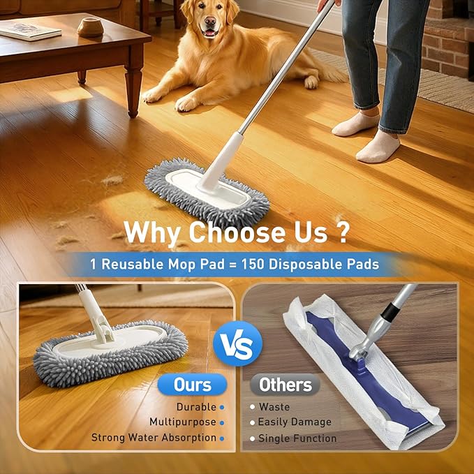 - MACHINE WASHABLE MOP COVERS: Say goodbye to disposable pads and enjoy cleaner floors with less waste. Our chenille mop pads are machine washable and can be reused up to 150 times. The pads are ideal for picking up pet hair, leaving your floors spotless without the hassle