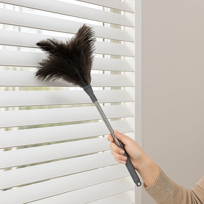 - Natural Ostrich Feathers – Soft, flexible feathers trap and hold dust without scratching delicate surfaces.