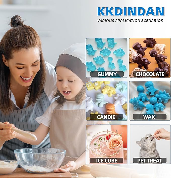 - 4PCS DINOSAUR MAKING SET: Includes 4 Dinosaur-shaped silicone molds and 2 droppers of 5ml, allowing you to create a total of 192 1ml bear candies in one go. With mold dimensions of 7.5"x4.6", it's perfect for crafting delicious treats either on your own or with your kids.