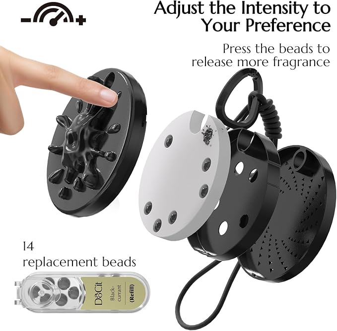 - Bead-Release Fragrance Control: Unlike bulky vent clips or sticky pads, our innovative bead-release system gives you effortless scent control. Adjust the intensity to match your mood with just a touch. The scent activates automatically upon hanging—no pressing needed for initial use. For a bolder aroma, simply press the beads to release an intense burst of fragrance. Enjoy elegant customization with no obstruction and no residue.