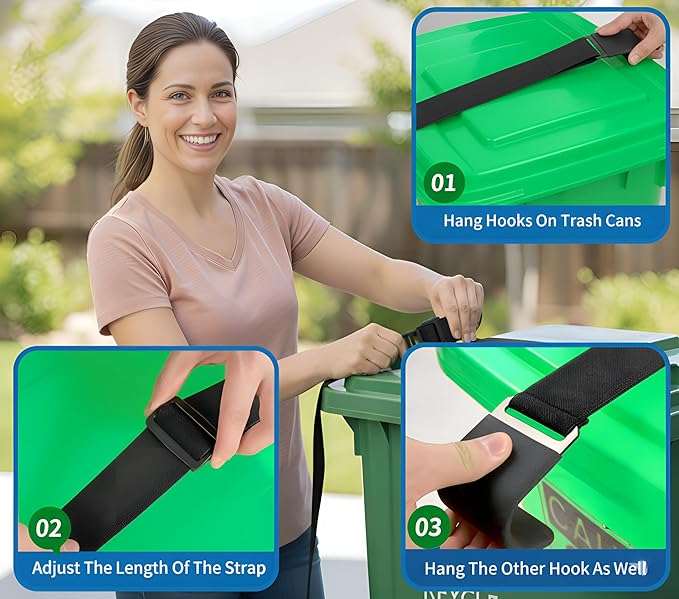 Premium 2 Trash Can Locks for Animals Garbage Straps Lid Wheelie Bin Locks Enclosure Cans Clips Out Raccoon Raccoons Hide Outside Strap Resistant Security Critter Trashcan Deterrent