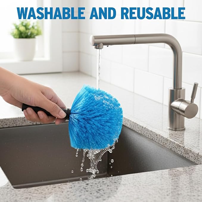 - Wide-Area Brush for Efficient Debris Pickup: Step up from undersized brushes. Our model includes an expanded brush face filled with plush yet firm bristles that actively trap dust, spider webs, and dirt particles. For optimal fluffiness after unboxing, a quick blow-dry or gentle hand-shaping is recommended. Its broad surface efficiently covers sizable areas like garage walls and ceilings, positioning it as a functional option among cleaning supplies for both interior and exterior use.