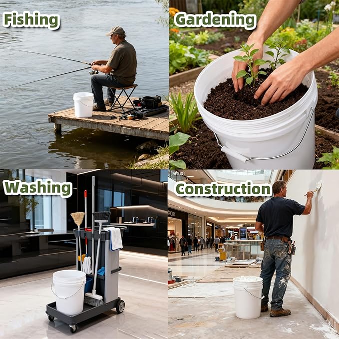 - Durable and Heavy-Duty: This set includes three 5-gallon plastic buckets with lids and one 2.6-gallon plastic bucket with a plastic handle. The 5-gallon buckets feature sturdy iron handles for extra durability. Each bucket comes with a lid for convenient stacking and offers excellent sealing performance. They are resistant to cracking, deformation, and chemical corrosion, ensuring no leakage during transport. These round buckets are also ideal for mixing and storing paint, adhesives, cleaning agents, and other materials.