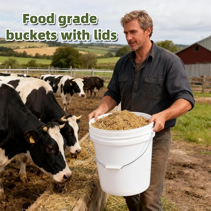- Storage Function: The food grade buckets offer storage capabilities; The sizable interior allows you to store beans, rice, flour, sugar, salt, pasta, honey, pet food, poultry feed, bird food; Also the plastic pail applied for safe storage of charcoal, mulch, grass seed, paint, cement slurry, liquid, powder, oil, agricultural products, fertilizers, garden hose and other products.