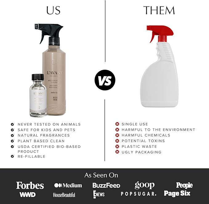 - Eco-Friendly Cleaning Solution – Crafted with plant-based ingredients and packaged in a recycled plastic spray bottle, this cleaner reduces waste and minimizes environmental impact. Refills are available in elegant eco-luxe glass bottles, promoting sustainability without compromise.