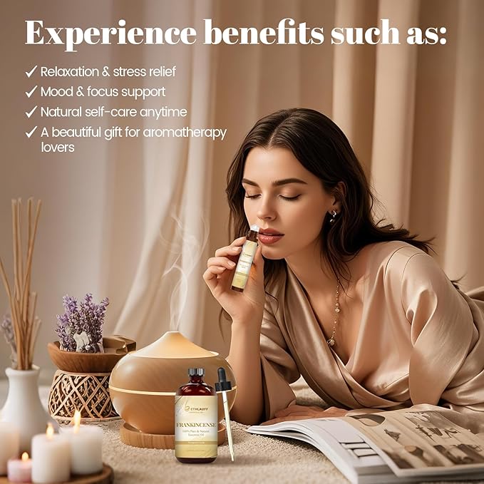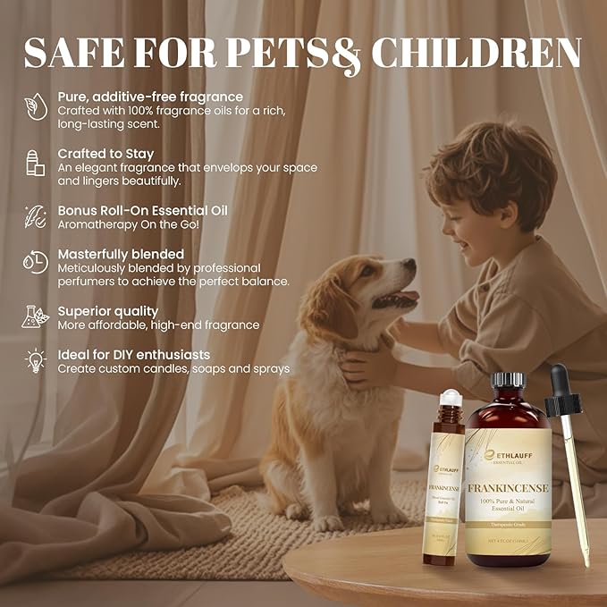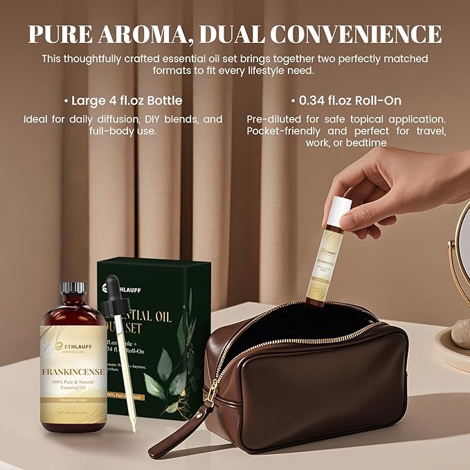 Frankincense Essential Oil (4 fl.oz Bottle + 0.34 fl.oz Roll-On) — Frankincense Oils for Aromatherapy, Diffusers, Humidifiers, Home fragrances, DIY Skincare, Candle, Soap Making, Relaxation, Yoga