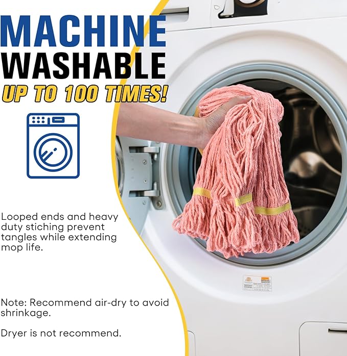 - Washable and Long-Lasting: Commercial mop heads are launderable for extended long-term usage. Long-lasting fibers allow the mop head to be washed many times giving it a longer service life. This washable mop head is launderable up to 100 times! NOTE: Do not use dryer after laundering to avoid shrinkage and loosen string, air-drying is recommended.