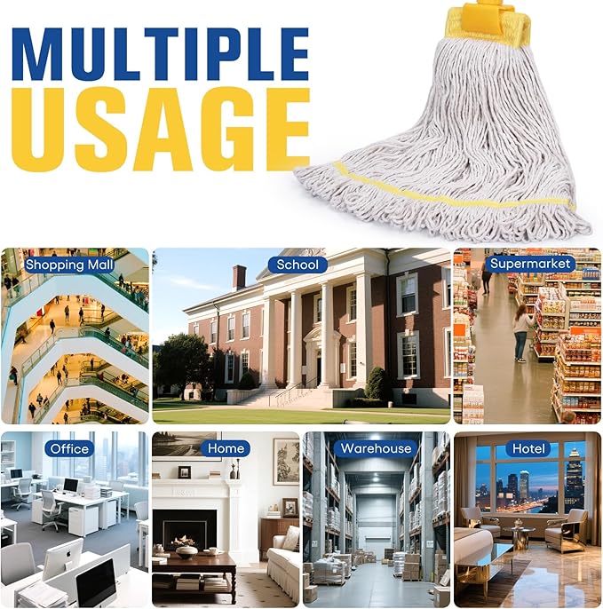 - Washable and Long-Lasting: Commercial mop heads are launderable for extended long-term usage. Long-lasting fibers allow the mop head to be washed many times giving it a longer service life. This washable mop head is launderable up to 100 times! NOTE: Do not use dryer after laundering to avoid shrinkage and loosen string, air-drying is recommended.