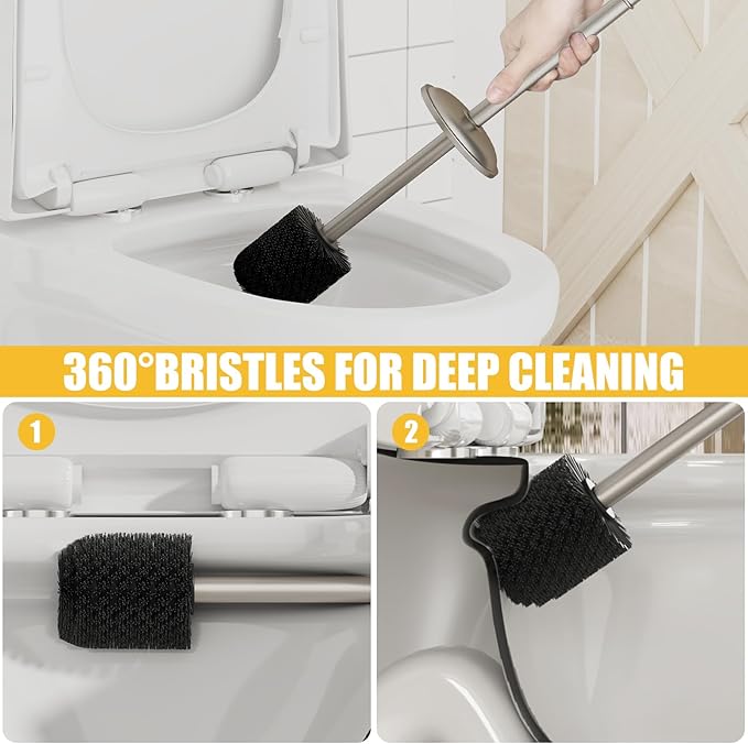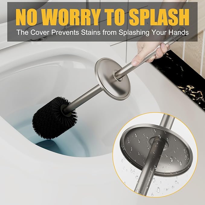 - Durable Long Handle: This toilet brush comes with a elongated ergonomic handle and a covered brush holder to prevent splashing back. The ultra long stainless steel handle extends deeply, making it easy for you to clean the toilet.
