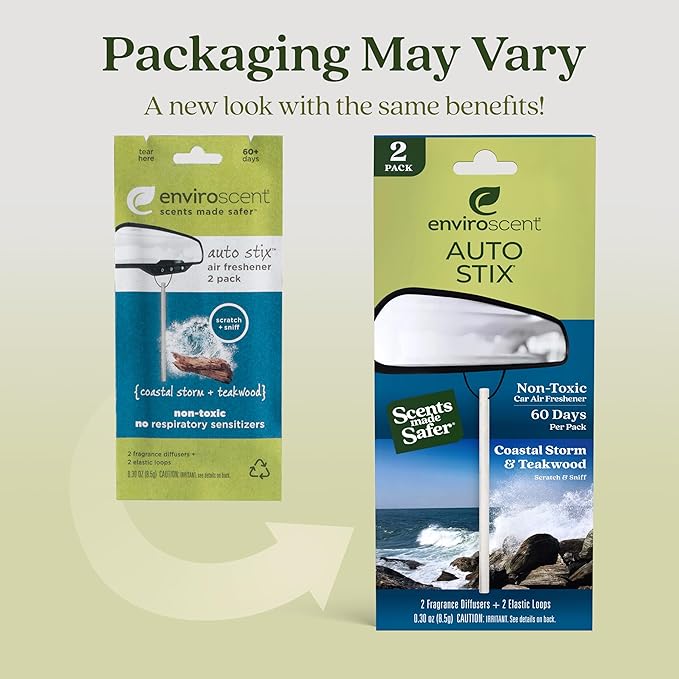 Enviroscent Non-Toxic Car Air Freshener | Natural Car Air Freshener | Essential Oil Diffuser | Car Scent Lasting Over 480 Days | 8 Packs of 2 Hanging Auto Stix (Coastal Storm & Teakwood)