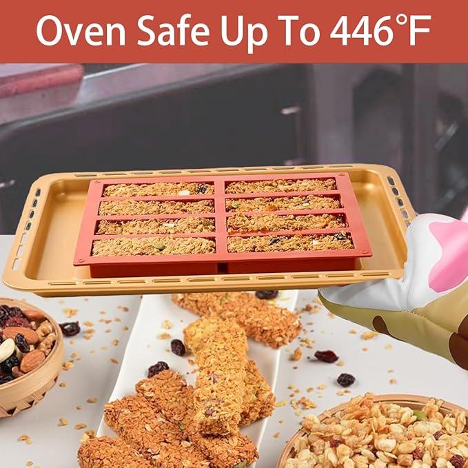 - Easy Baking: Includes a 1-piece set of 8-cavity granola bar silicone molds and a 3-piece set of baking spatulas to help you easily create your favorite chocolate bars, nutritious cereal bars, protein energy bars and brownie cake cheesecake and other desserts and snacks, and unleash your culinary creativity.