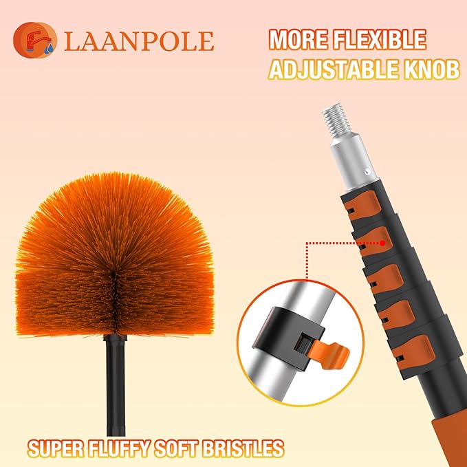 - Efficient Cleaning Capability:LAANPOLE cobweb duster boasts dense and upright bristles that effectively remove stubborn spider webs and dust both indoors and outdoors. The cobweb duster with extension pole designs make it perfect for cleaning high ceilings, corners, and fans, delivering remarkable cleaning results.