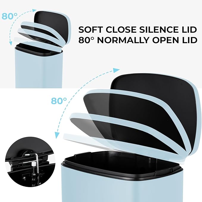 - Quiet Closing&Lid-lock: Heavy-duty garbage can is built with integrated step pedal mechanism and the force damper, which soft open and close lid while preventing slamming and banging. Lid-lock can help keep trash can open without stepping if you are inconvenient to keep stepping on pedal.