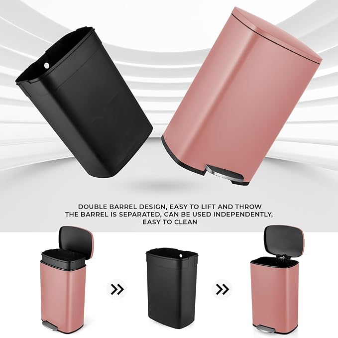 - Quiet Closing&Lid-lock: Heavy-duty garbage can is built with integrated step pedal mechanism and the force damper, which soft open and close lid while preventing slamming and banging. Lid-lock can help keep trash can open without stepping if you are inconvenient to keep stepping on pedal.