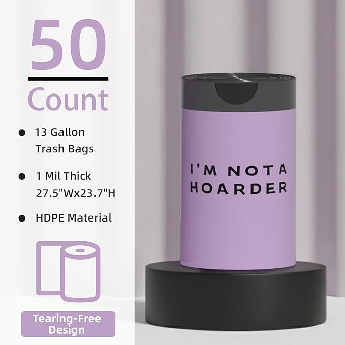 - Durable & Elegant: This 13-gallon garbage bag features Not Hoarder printing. It measures 27.5 inches (L) x 23.7 inches (W), with a thickness of 1 mil, making it an ideal storage solution for home organization.