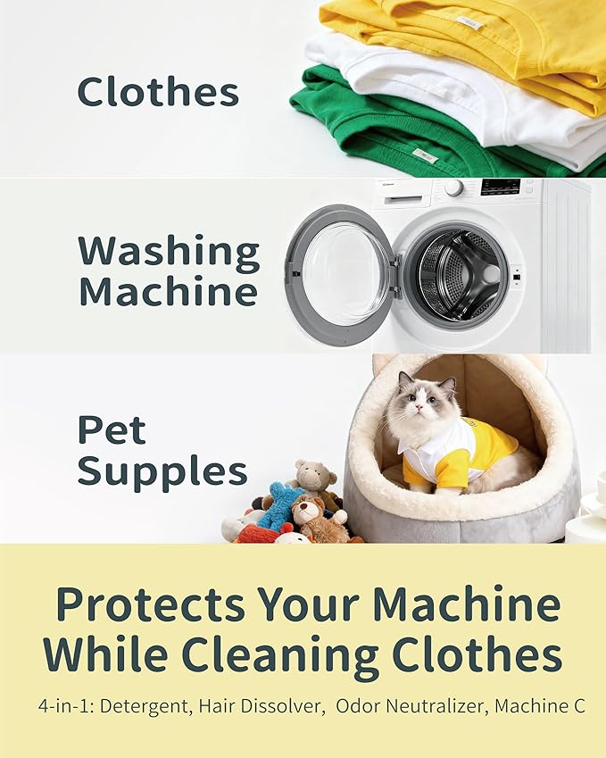 - 96.7% EFFECTIVE PET HAIR DISSOLVER:Our advanced enzymatic formula is scientifically designed to dissolve away up to 96.7% of stubborn pet hair from fabrics in the wash. It breaks down hair deep within fibers, preventing clogging in your machines
