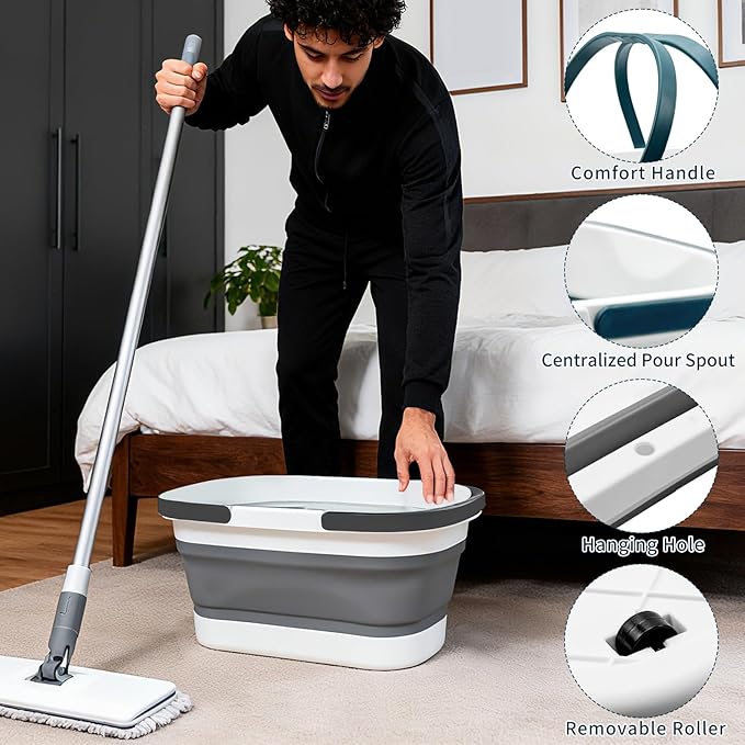 - Practical Foldable Design: 2 Pack collapsible plastic bucket equipped with 2 carrying handles and wall-mountable hanging holes, rollers at the bottom, grey and green; these buckets are easy to transport and store; the wide opening accommodates various mop styles, including flat, wringing, squeeze, and rotary mops
