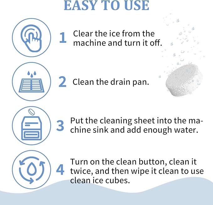 - Widely used and easy to operate: specially designed for all ice machines with household countertops. The ice maker cleaner tablets use steps are clear and simple (usually just run the ice-making cycle after dissolution), and the countertop ice maker cleaner is easy to maintain the health of the machine